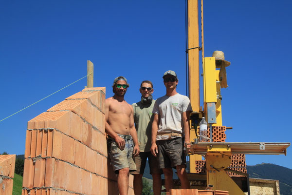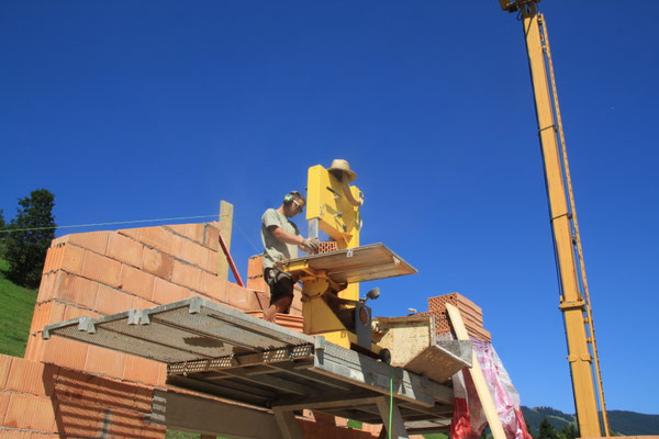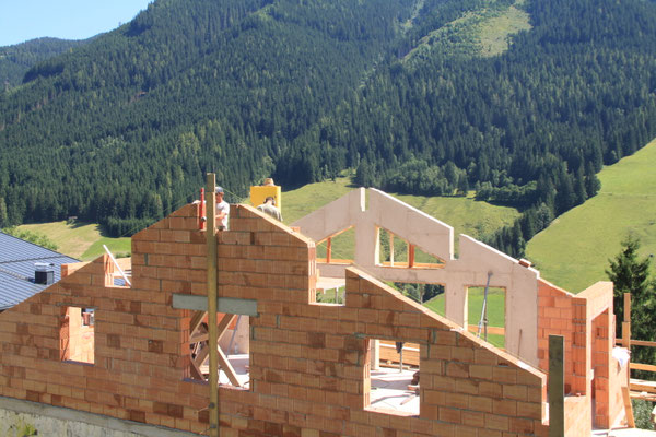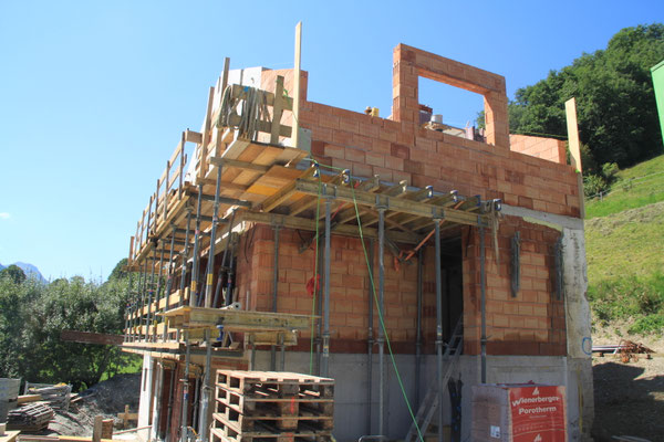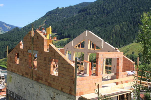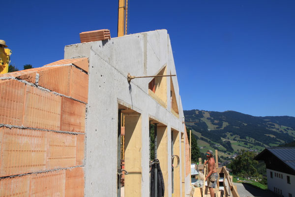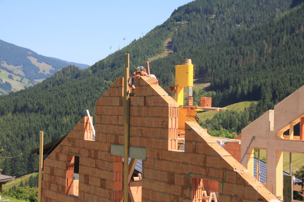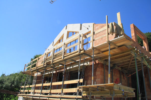 Unglaublich aber wahr: an 28 der zurückliegenden 30 Tage hat es geregnet! Nun aber herrscht wieder Kaiserwetter. Gerade richtig, um das Giebelmauerwerk bei diesem teilweise neu gebautem Wohnhaus fertig zu stellen!