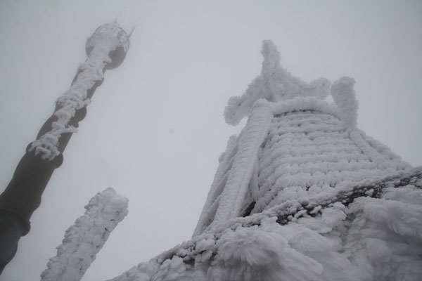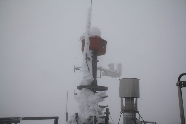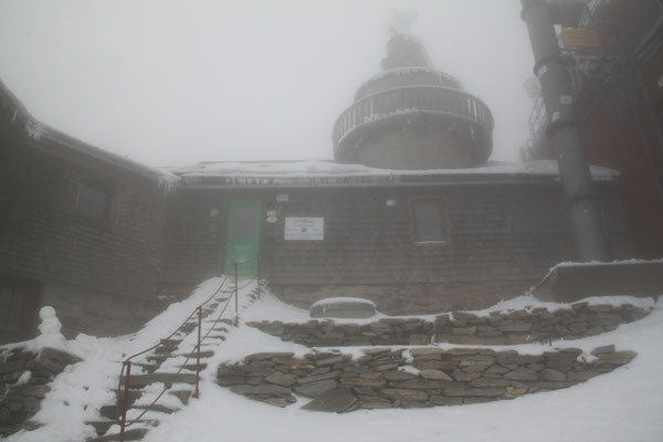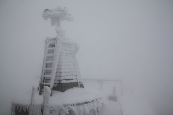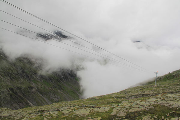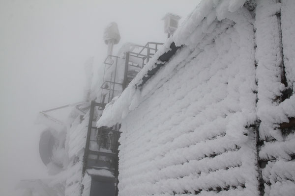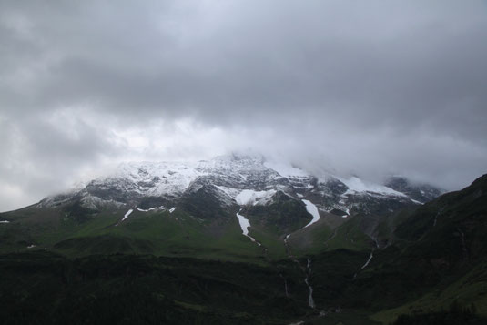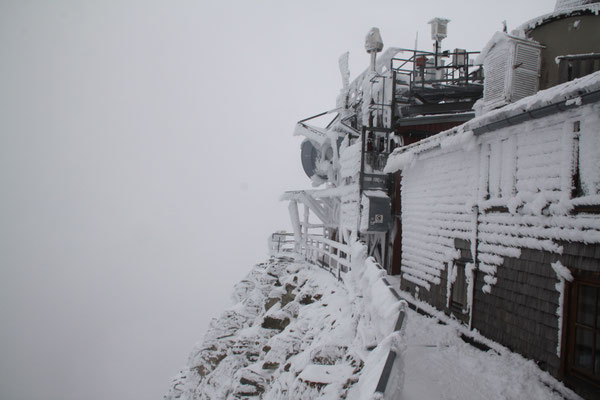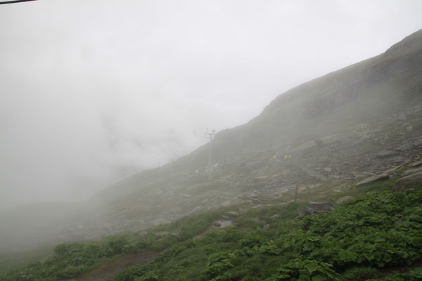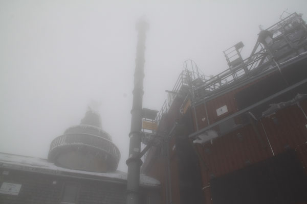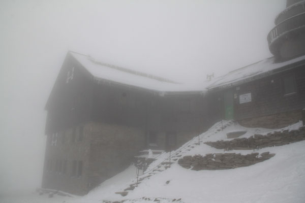 Es passt zum verregneten Wetter im Juli, dass sich der Sonnblick an diesem Tag hinter düsteren Wolken versteckt. Schon bald ist der Talboden den Blicken entzogen und es ist wie eine Fahrt in weiße Nichts, mit bizarren Eis- und Schneeformationen an der Hütte sowie am historischen Stein- und am neuen Stahl-Wettermessturm. Die Lage der Gebäude am steilen Abgrund ist einfach nur spektakulär.