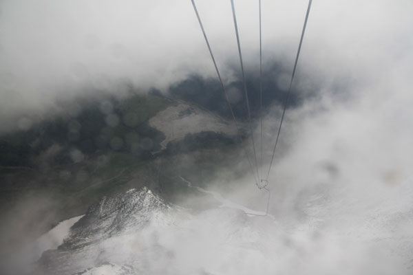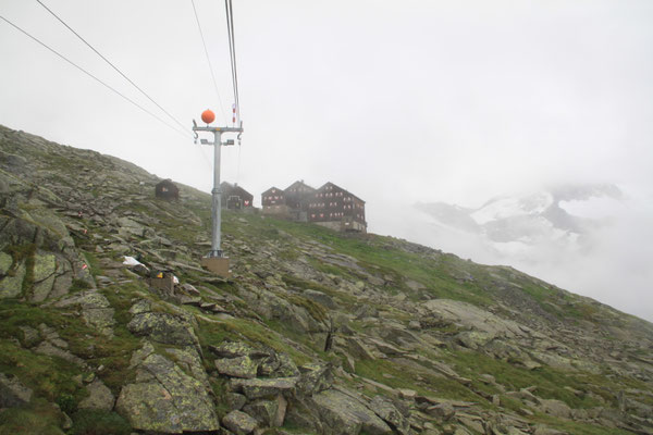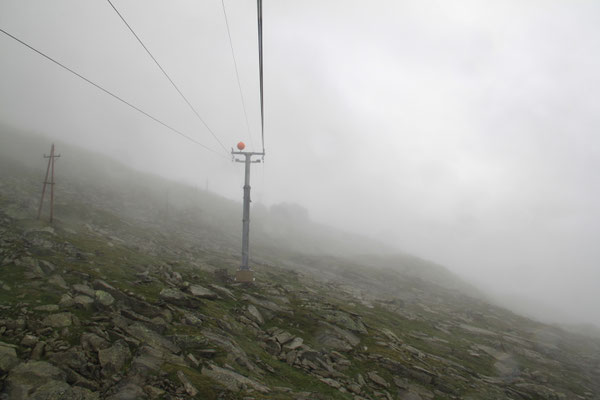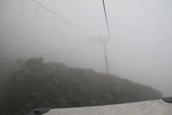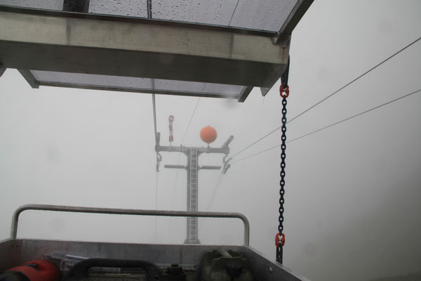 Die letzte Inspektionsfahrt im "Seilbahnwagerl" durch die Nebelsuppe, vorbei an dunklen Felsformationen gleicht einer Fahrt ins Ungewisse, bevor die Hütte dann langsam aus dem Grau der Wolken auftaucht.