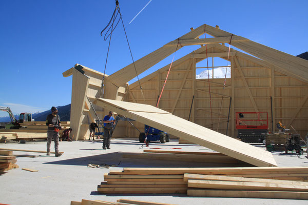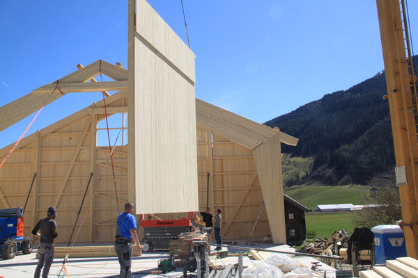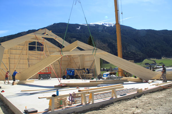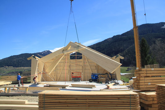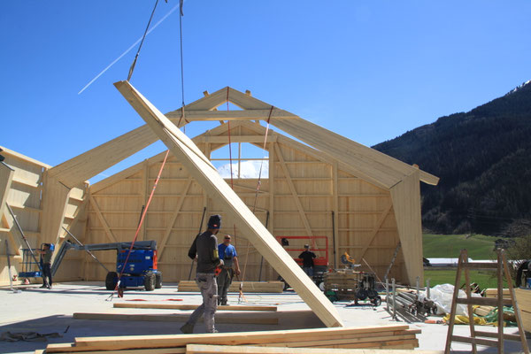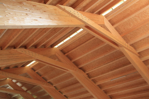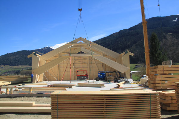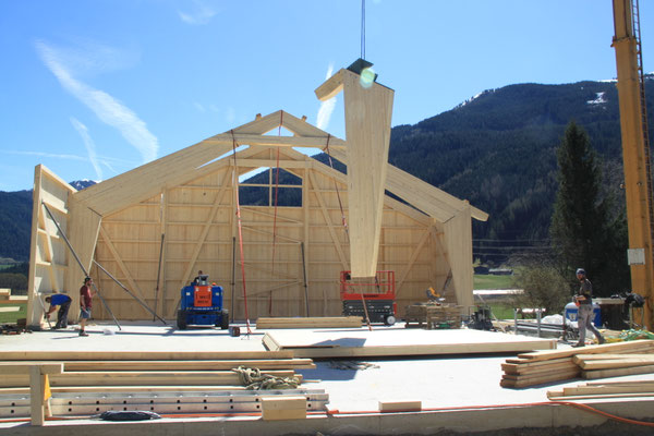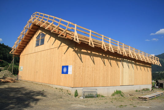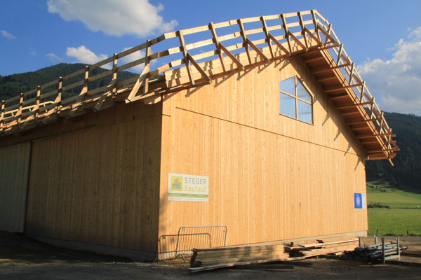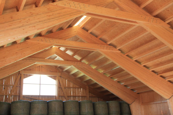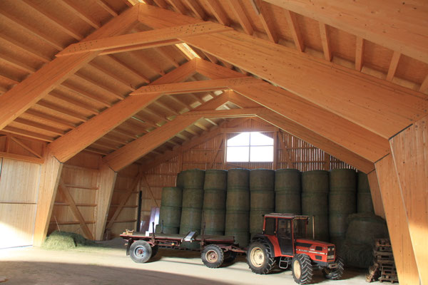 Ein über 18 m frei gespanntes Tragwerk, mit über 5 Tonnen schweren Dreigelenksbindern charakterisieren diese Heu- und Gerätehalle!