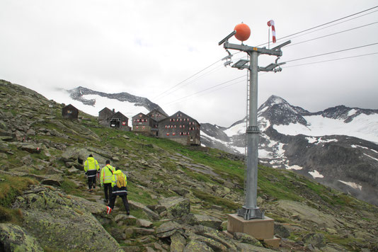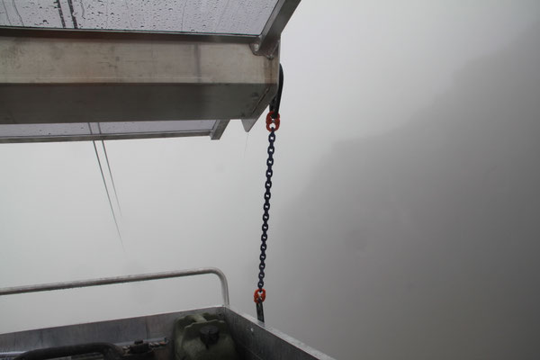 Wieder ist es ein nasser und nebeliger Tag, als die behördliche Abnahme der neuen Materialseilbahn zur Kürsinger Hütte ansteht.