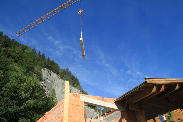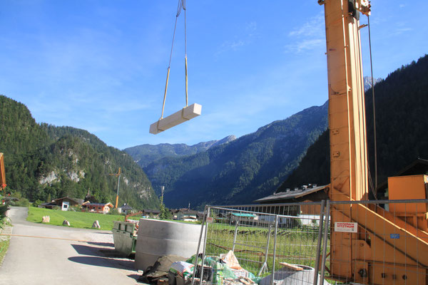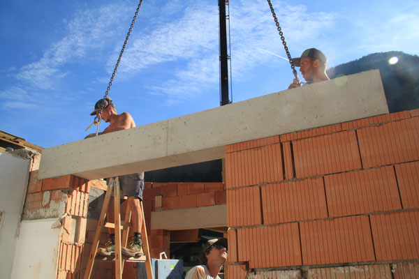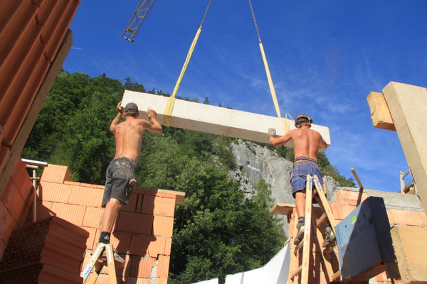 Umso besser, wenn auch das Wetter wieder mitspielt, wie hier bei unserer Baustelle unterhalb des Klettergartens in Weißbach. Gerade wird bei sommerlichen Temperaturen ein vor Ort angefertigter Betonträger versetzt.