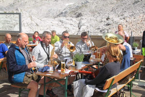 Nach Fertigstellung kommt die gesamte Hüttenmannschaft zusammen, um das neue Bauwerk zu inspizieren. Um dann gleich feststellen zu können, dass sich Plattform auch ganz hervorragend als Österreichs höchste Tanzbühne nutzen lässt!