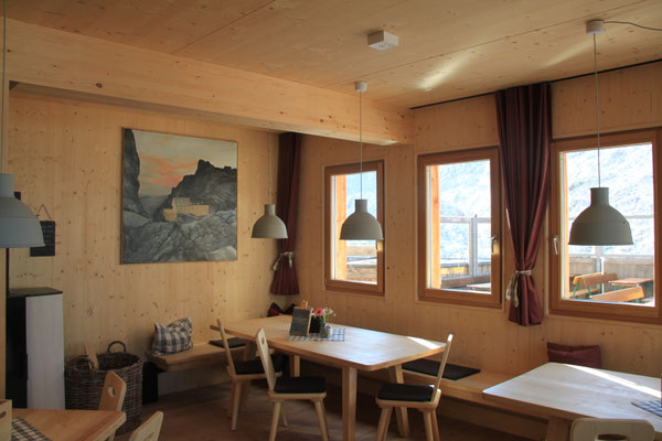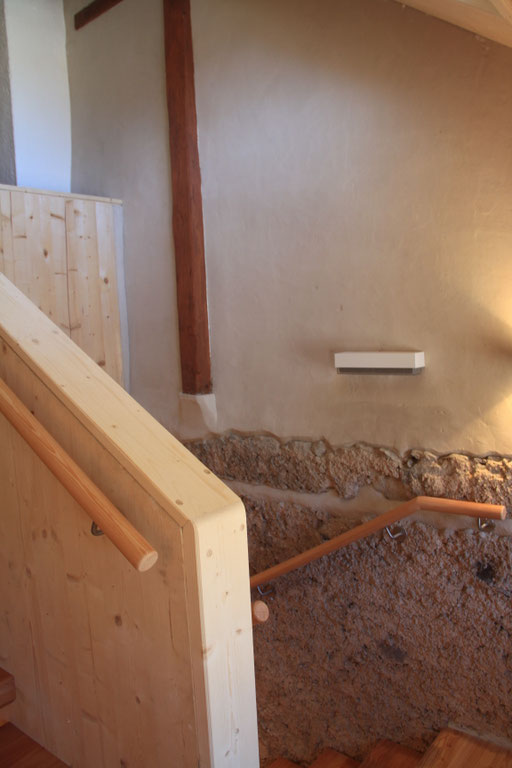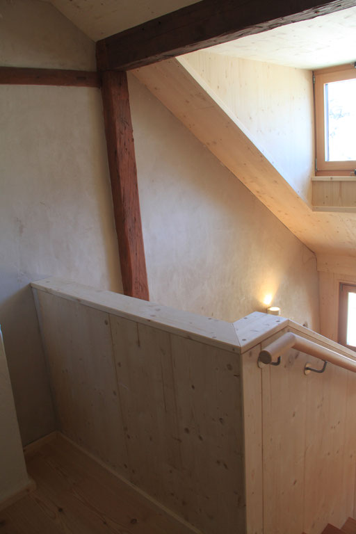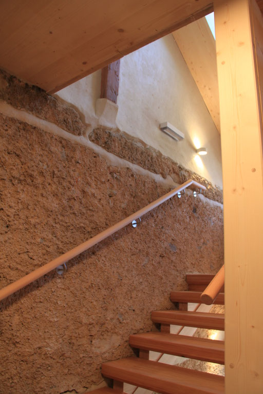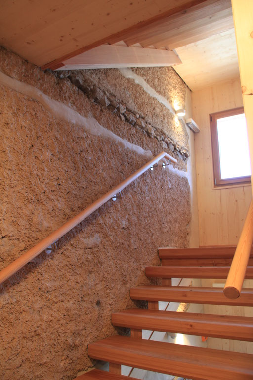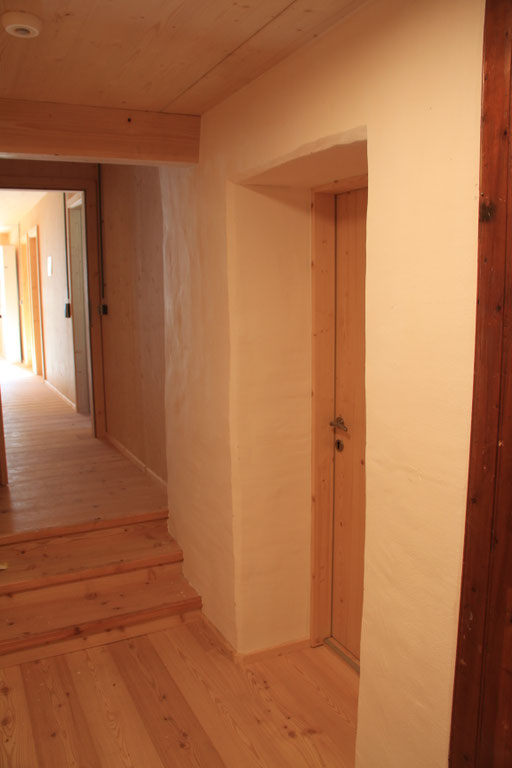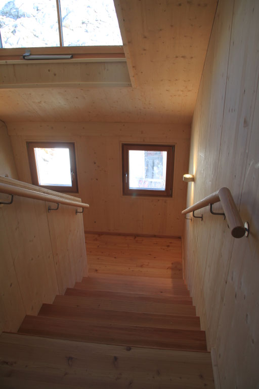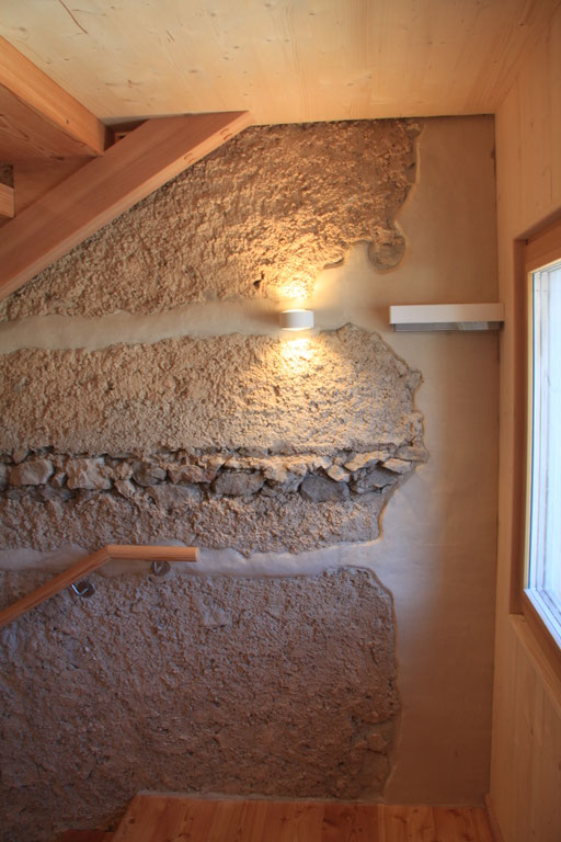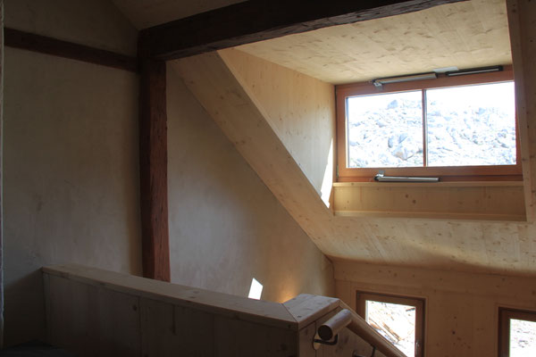 Dieses befindet sich am Übergang zwischen Alt- und Neubau. Wir haben viel Zeit und Mühe investiert, um diese "Schnittstelle" zur historischen Hütte wieder sichtbar zu machen. Die ursprünglich geplanten Beton-Stiegen wurden durch offene Lärchenholz-Stiegen ersetzt, und der historische, von Natursteinlagen durchzogene Rieselputz wurde wieder freigelegt. An den schadhaften Stellen wurde ein händischer Sanierputz mit Kellen-Glattstrich aufgebracht. Dadurch ergibt sich ein lebendiges Wandbild, und man kann beim Betrachten förmlich ein wenig Luft aus den Urzeiten der alten Hütte atmen.