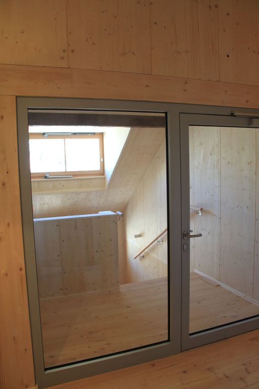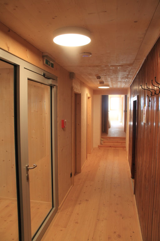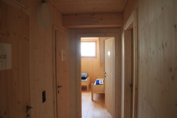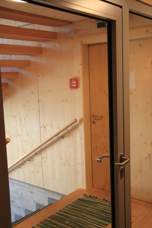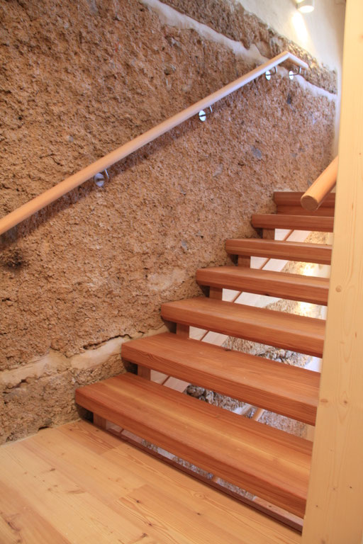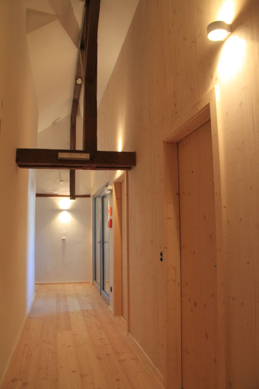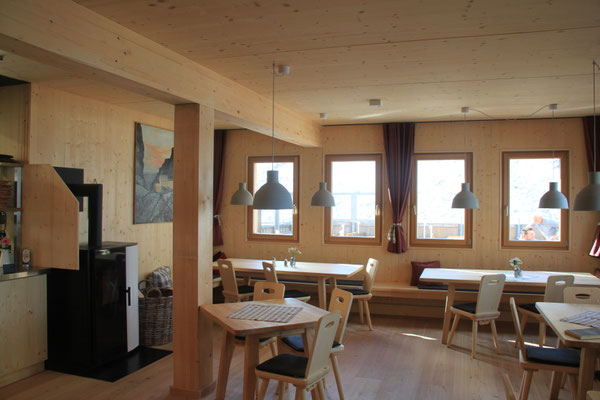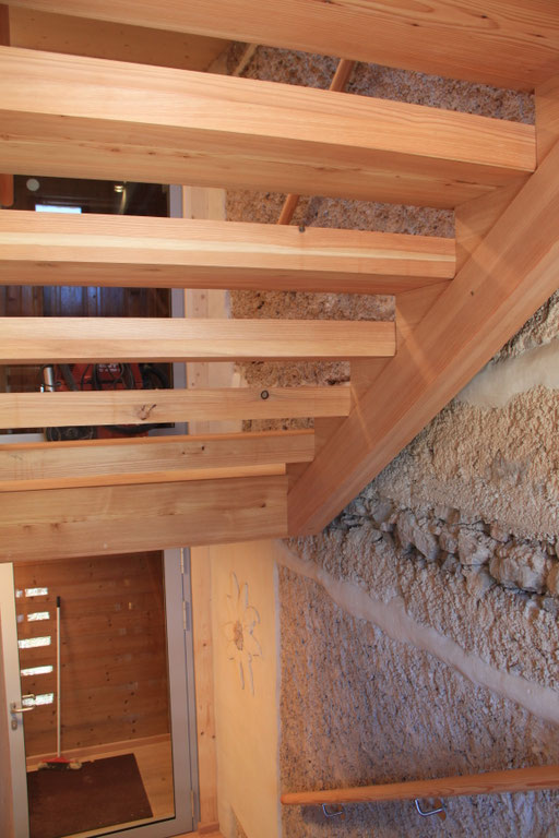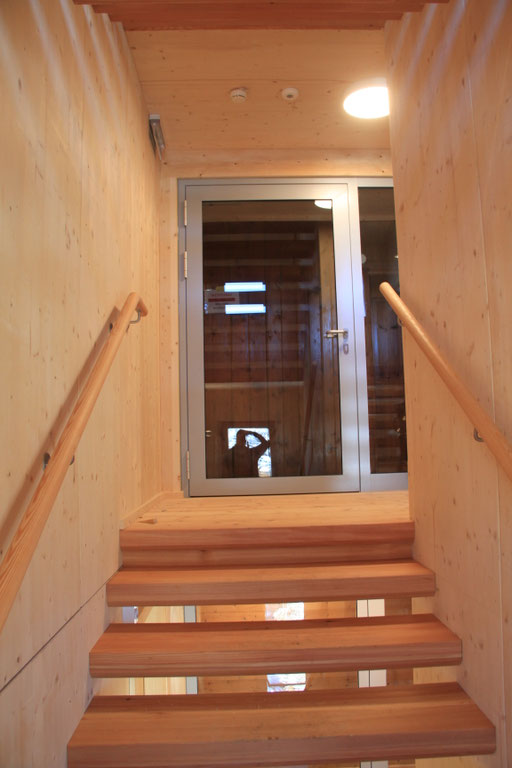 Dieses befindet sich am Übergang zwischen Alt- und Neubau. Wir haben viel Zeit und Mühe investiert, um diese "Schnittstelle" zur historischen Hütte wieder sichtbar zu machen. Die ursprünglich geplanten Beton-Stiegen wurden durch offene Lärchenholz-Stiegen ersetzt, und der historische, von Natursteinlagen durchzogene Rieselputz wurde wieder freigelegt. An den schadhaften Stellen wurde ein händischer Sanierputz mit Kellen-Glattstrich aufgebracht. Dadurch ergibt sich ein lebendiges Wandbild, und man kann beim Betrachten förmlich ein wenig Luft aus den Urzeiten der alten Hütte atmen.