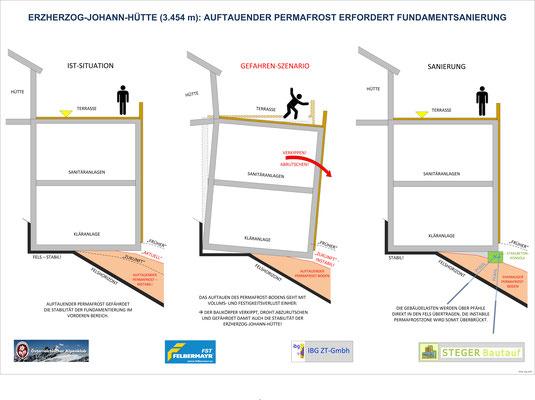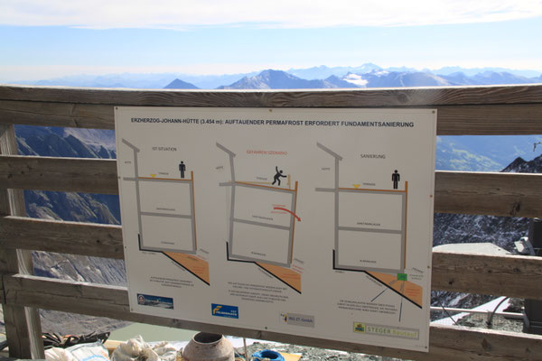 Davon betroffen ist auch die Erzherzog-Johann-Hütte am Großglockner. Dort besteht das akute Risiko, dass ein vor ca. 30 Jahren errichteter Zubau für Sanitär- und Kläranlage verkippt und abrutscht.