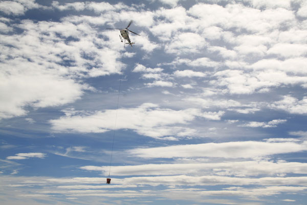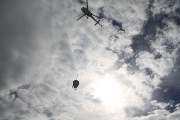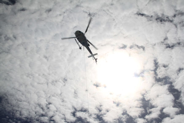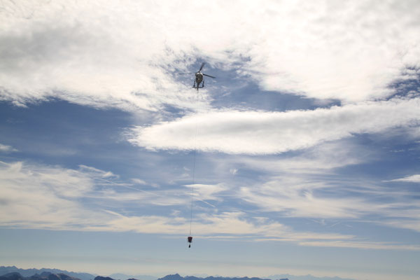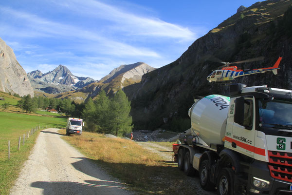 Nach den Schneefällen ist es klirrend kalt geworden am Amersee - minus 15 ° zeigt das Thermometer. Die Baustelle liegt an der Grenze zu Licht und Dauerschatten. Die Tage sind schon kurz, und so müssen zwei Hubschrauber zeitgleich fliegen, um den erforderlichen Wandbeton noch vor Einbruch der Dunkelheit vom Nordportal des Felbertals hoch zum Stausee zu bringen.