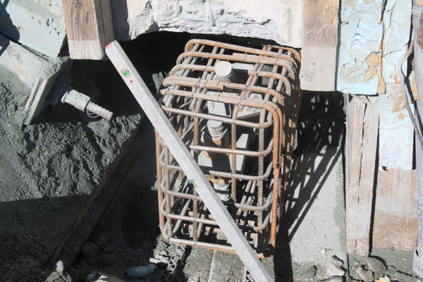 Letzte Woche haben wir händisch Aushubarbeiten durchgeführt. Heute werden die Pfähle zur Überbrückung der instabilen Permafrostzone gebohrt. Danach wird die massive Bewehrung eingebaut und die Stahlbetonkonsolen eingeschalt (zum Teil unter "liegenden" Bedingungen, siehe Foto).