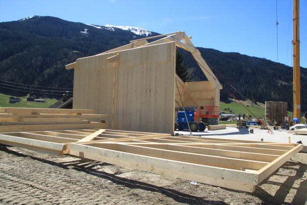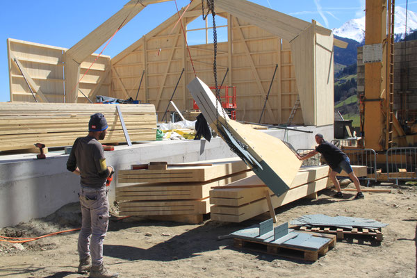 Die Decke im Dachboden wird verschalt, im Erdgeschoss ist gerade die Küche aufgestellt worden und im Gastraum wird ein mächtiger Dielen-Lärchenboden verlegt. Damit kann in den nächsten Tag wie geplant der Gastbetrieb in der neuen Stube aufgenommen werden.