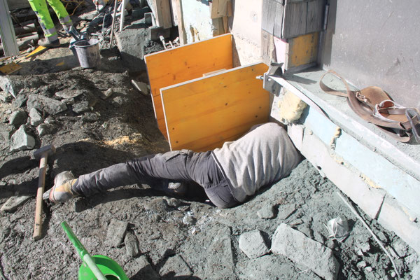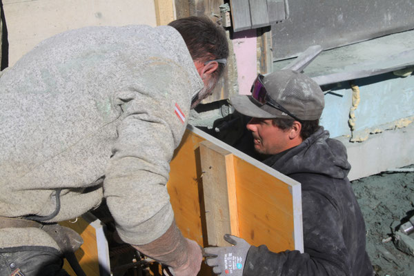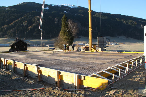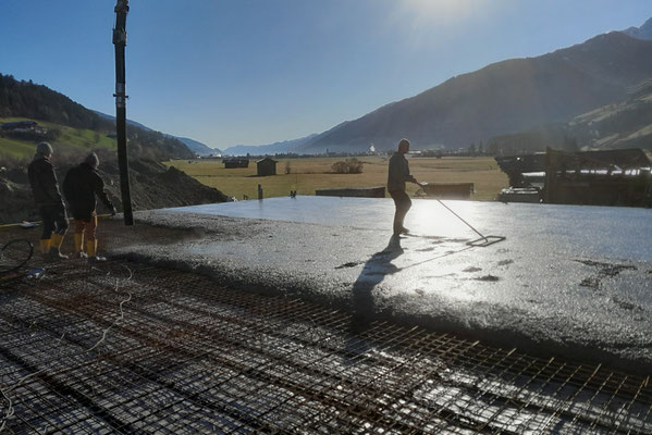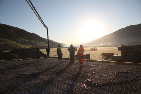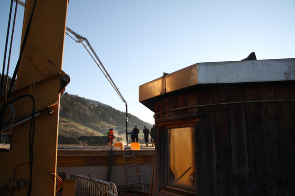Die fortgeschrittene Jahreszeit, die schattige Lage im Hinterlengauer Graben und ein "Sonnenuntergang" bereits um 13:00 machen diese Baustelle zu einer frostigen Angelegenheit. Aber es hilft nichts, die Bodenplatte muss aus statischen Gründen noch heuer betoniert werden.