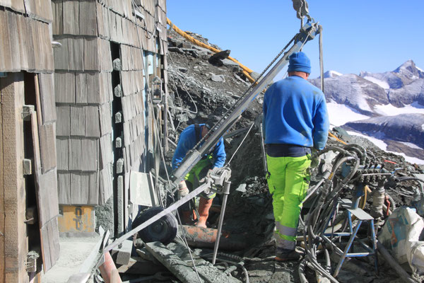 Nach der obligatorischen Wetterpause bahnt sich ein großartiger Herbsttag an: 10° Lufttemperatur in der Höhe und beinahe windstill - ideal zum Betonieren der Konsolen zwischen den Unterfangungs-Pfählen und dem gefährdeten Baukörper.