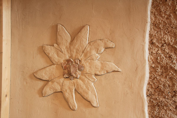 Der originale Verputz an alten Steinwänden des neuen Stiegenhauses bleibt erhalten und wo erforderlich, mit echtem Handputz ergänzt. Sogar ein Edelweiß haben unsere Leute kunstvoll an die Wand modelliert!