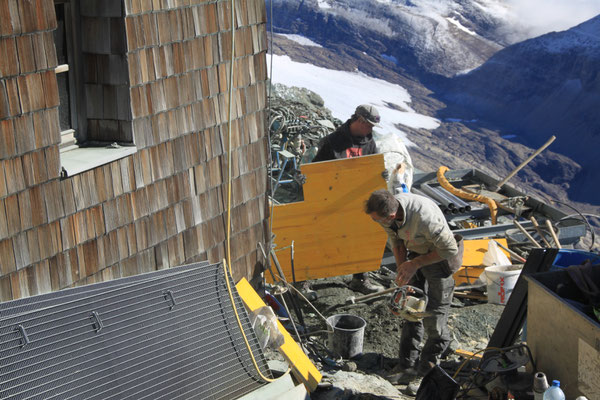 Trotzdem stehen ein paar Sanierungs- bzw. Erneuerungsarbeiten an. Die alten Glasscheiben werden gegen Isolierverglasungen ausgetauscht, die Fensterleibungen werden neu hergestellt, und eine neue Außentüre montiert. Ein Solar-Luft-Modul soll außerdem für eine permanente Temperierung der Hütte sorgen.