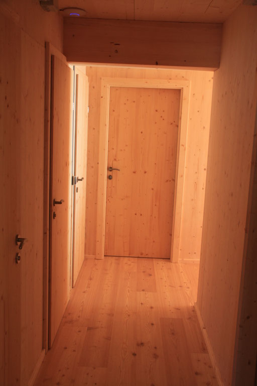 In der eigens entworfenen, zirbenen Windfangtüre und Hauseingangstüre lassen sich Andeutungen auf den Beruf und den Namen des Hauseigentümers erkennen. Eine Lärchverschindelung und Rauriser Natursteinplatten als Zugang runden den Einsatz von vielen heimischen und natürlichen Materialien bei diesem kleinem, aber feinem Bauvorhaben ab.