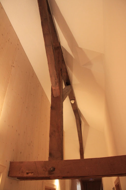 Im obersten Geschoß wurde das alte Dachstuhlgebälk wieder freigelegt, und auch damit ein ansprechender Übergang zu den Fluren des Neubaus geschaffen. Möchten Sie einen Rundgang durch dieses spezielle Stiegenhaus machen? Dann schauen Sie sich dieses Video an!
