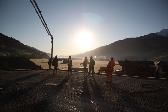 Das Baujahr 2025 startet sonnig, aber frisch! Beinahe mystisch ist die Morgenstimmung, als wir an einem kalten Frühlingsmorgen eine große Fundamentplatte in Mittersill betonieren.